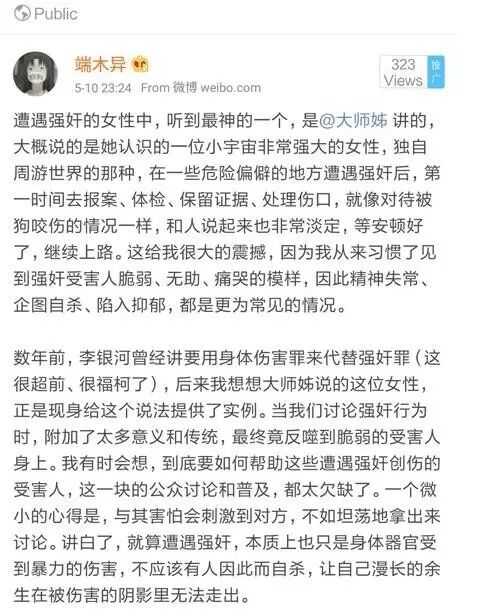 我们讨论强奸行为时,附加了太多意义和传统,最终竟反刍到脆弱的受害人身上……讲白了,就算是遭遇强奸,本质上也只是身体器官受到暴力的伤害,不应该有人因此自杀,让自己漫长的余生在被伤害的阴影里无法走出。